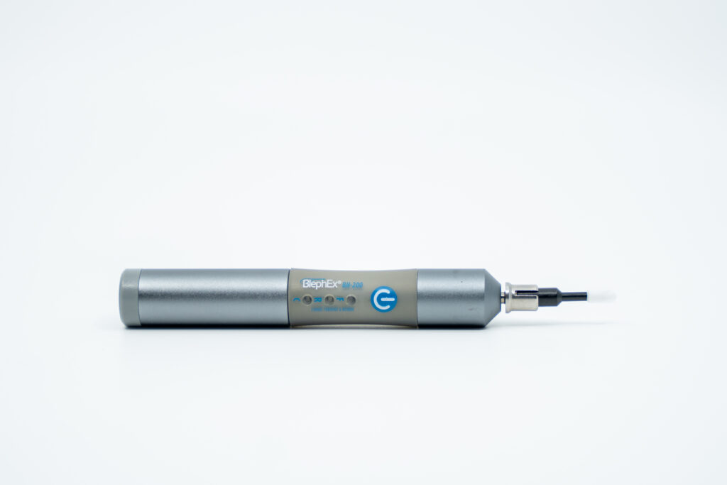 BlephEx® is a handheld medical device designed to remove years of accumulated biofilm and debris from the eyelid margins. It uses a soft, rotating micro-sponge to gently exfoliate the base of the eyelashes and clean the oil glands that line your lids.